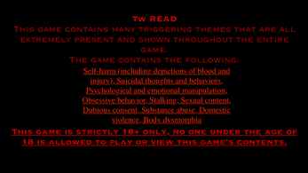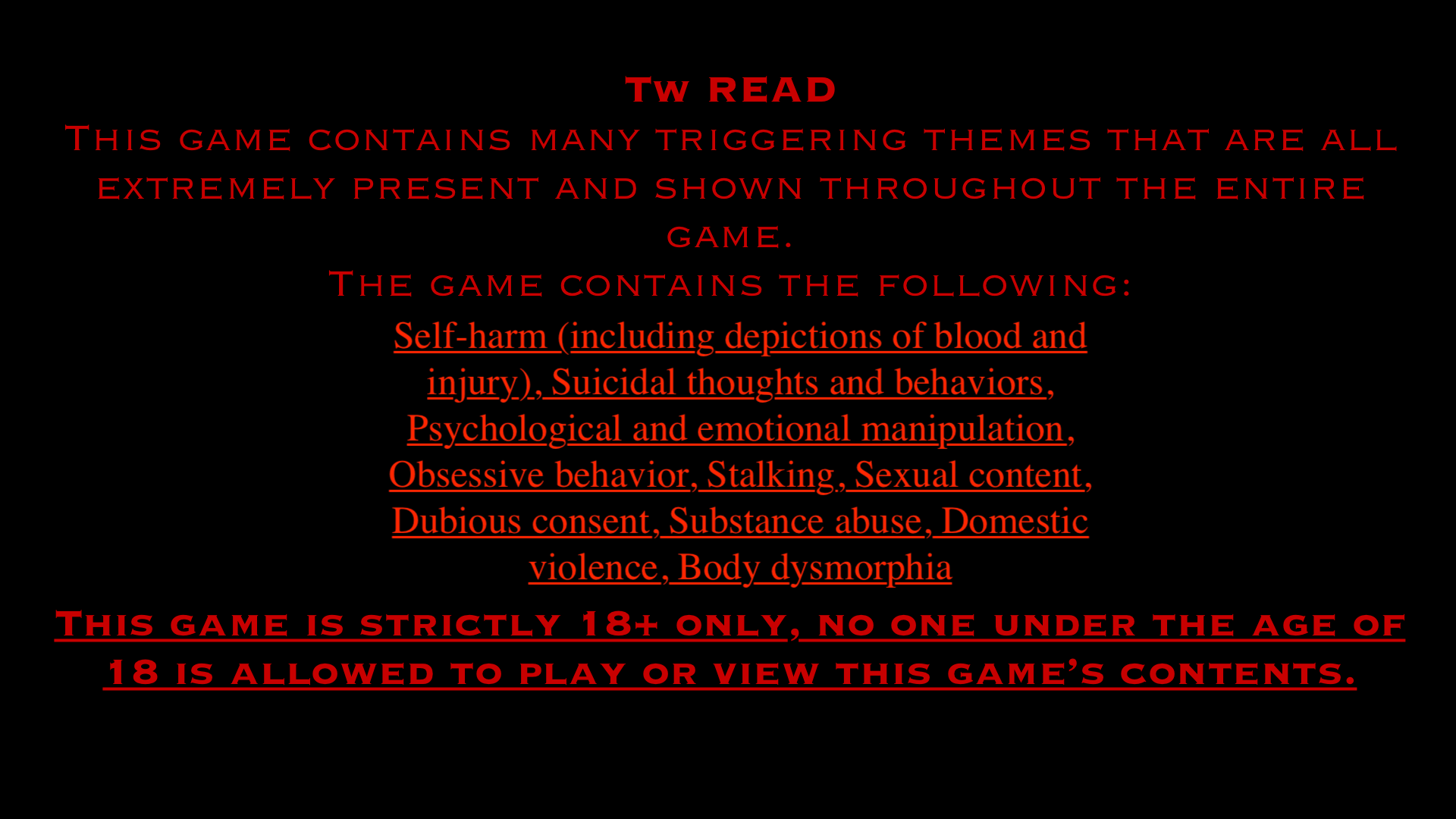This game contains explicit and highly triggeringcontent. It is strictly for players 18 and older. Do not engage with this game if you are underage or sensitive to the following material.